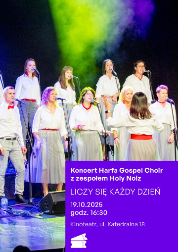 Zapraszamy na koncert Harfy Gospel Choir! Już 19 października chór prowadzony przez Annę Głogowską-Firlej wystąpi w kwidzyńskim Kinoteatrze w programie „Liczy się każdy dzień”. Podczas koncertu „Harfa” wykona pieśni gospel (w języku polskim oraz angielskim) – zarówno te pełne radości i pozytywnej energii, jak i poruszające serca słuchaczy, wprowadzające w wyjątkowy nastrój.
